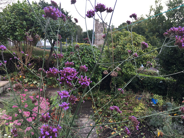 The hedge trimming has begun in haste. The blobby Camillia has had a drastic skirt lift trim, the scraggly budleja has been hard cut back and the bay tree re-pom-pomed. The Vebena Bonariensis is trying to steal the show here, but look at that text book pruning in the background!